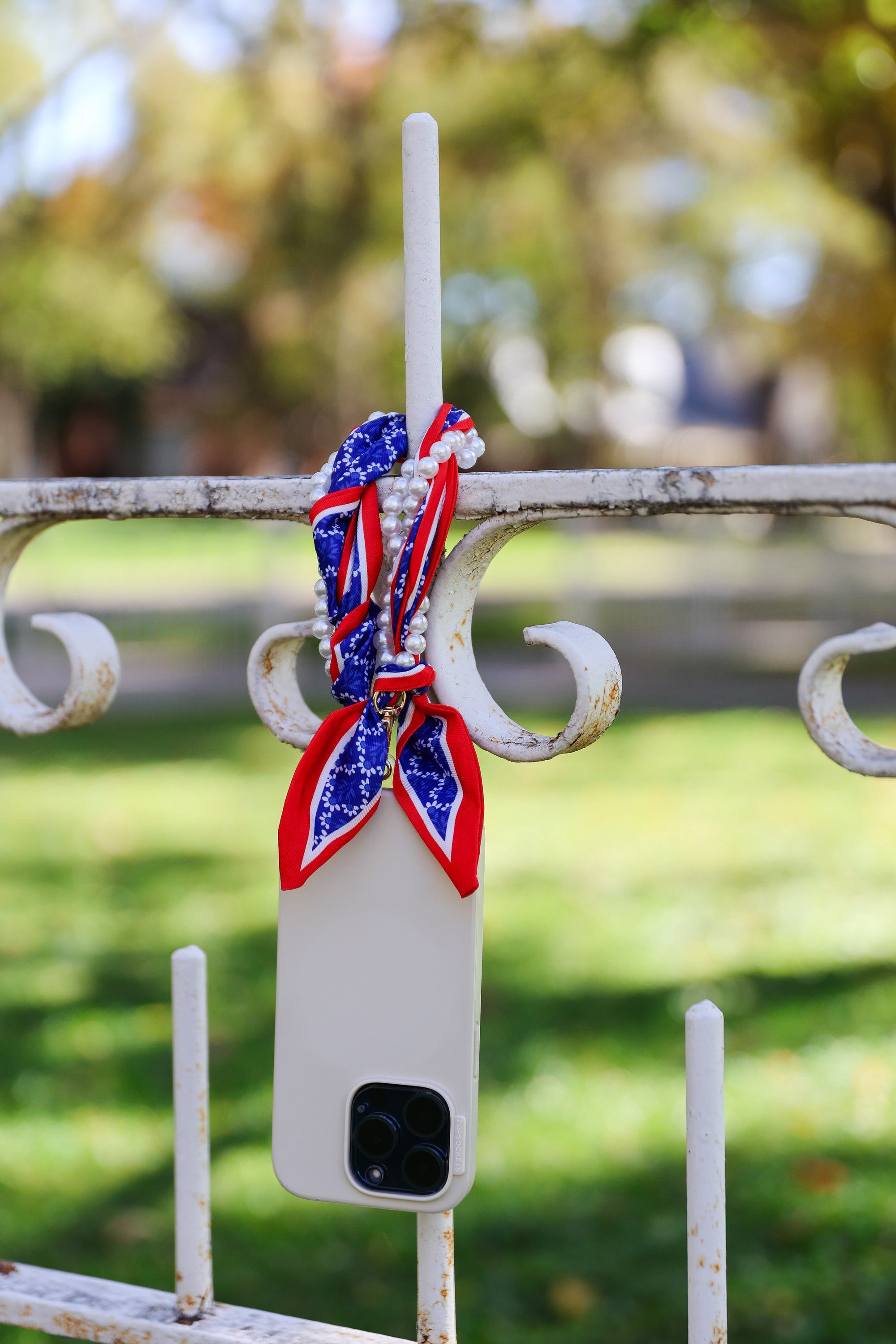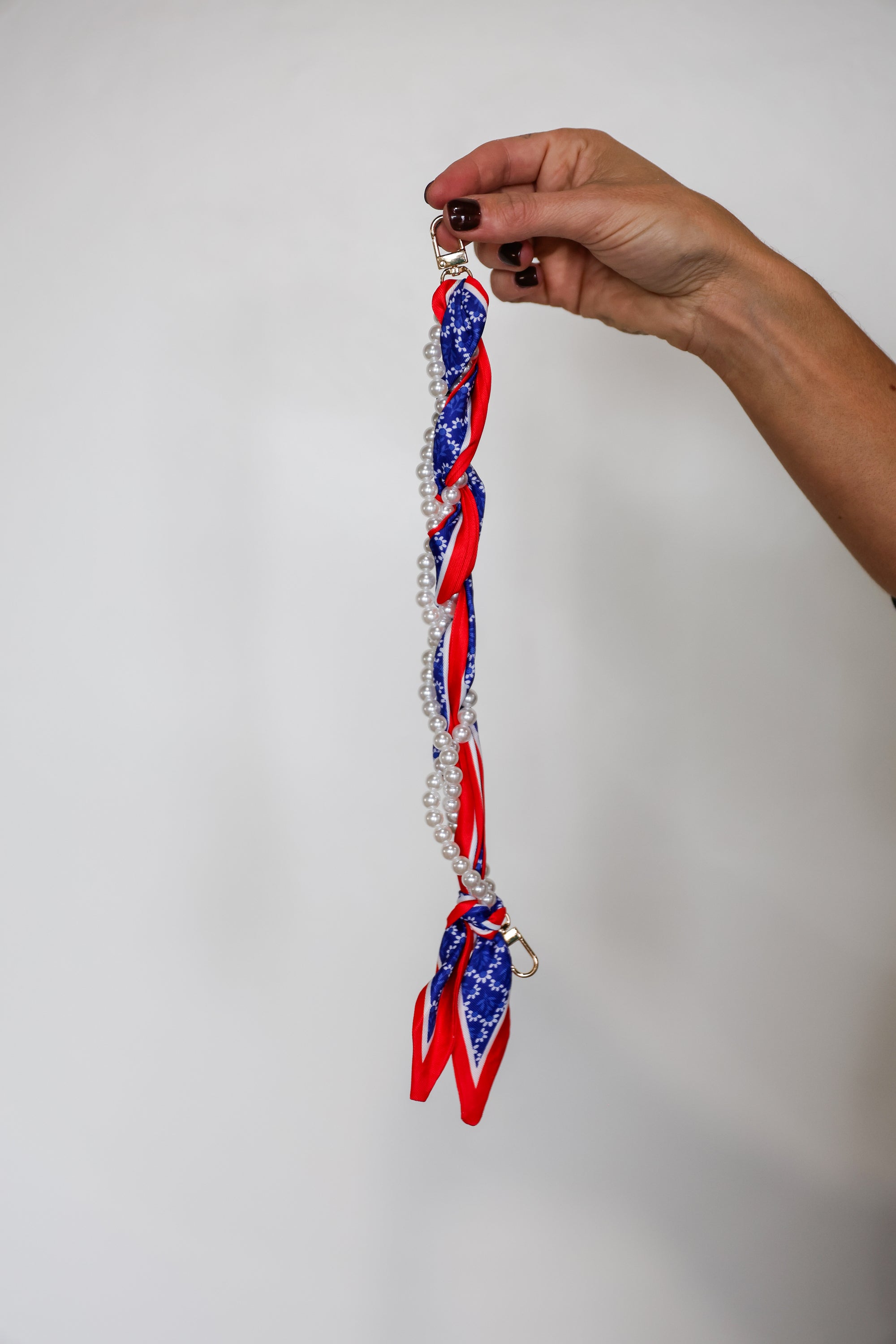 Woven Scarf Pearl Phone Strap/Wristlet - Blue & Red