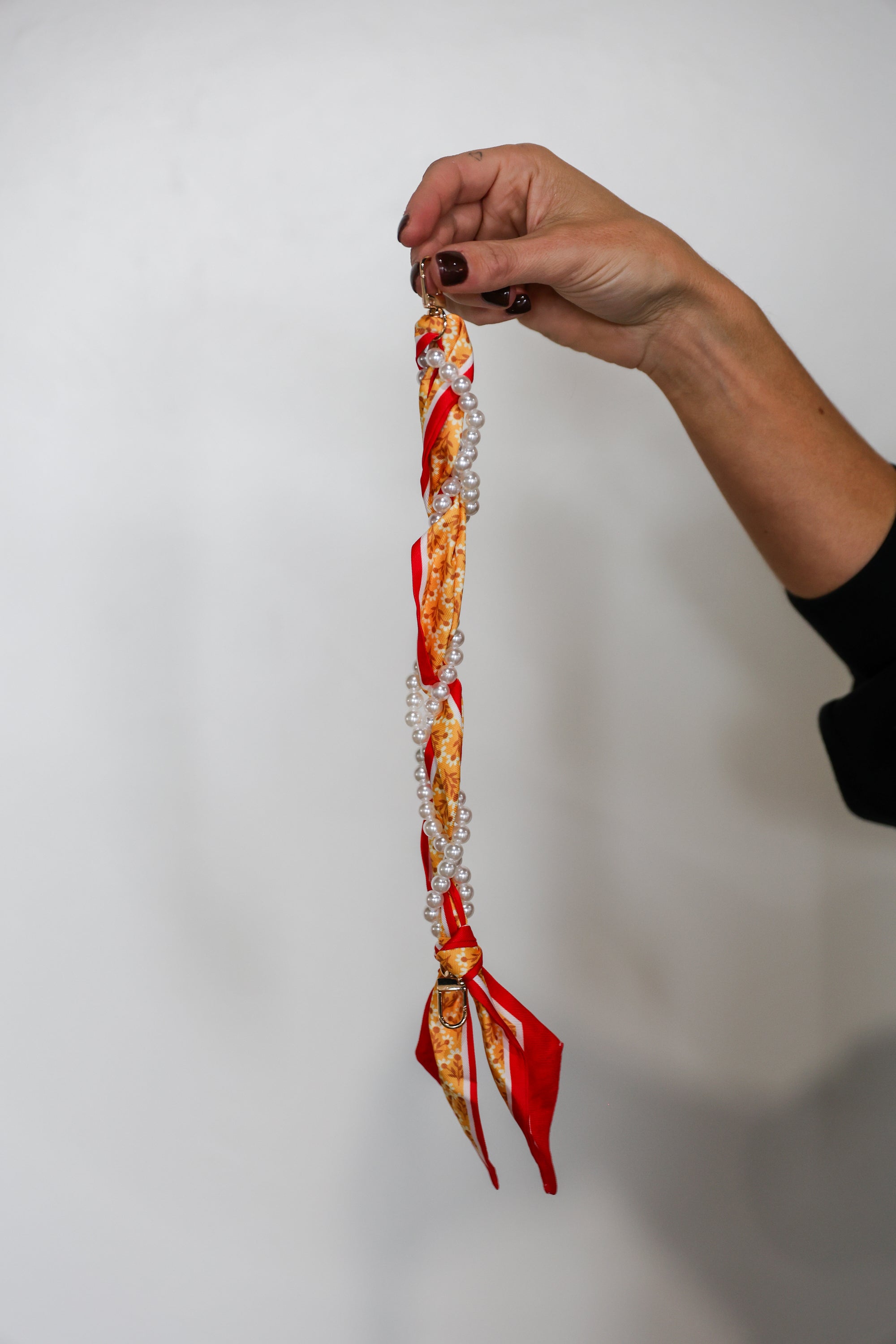 Woven Scarf Pearl Phone Strap/Wristlet - Red & Gold