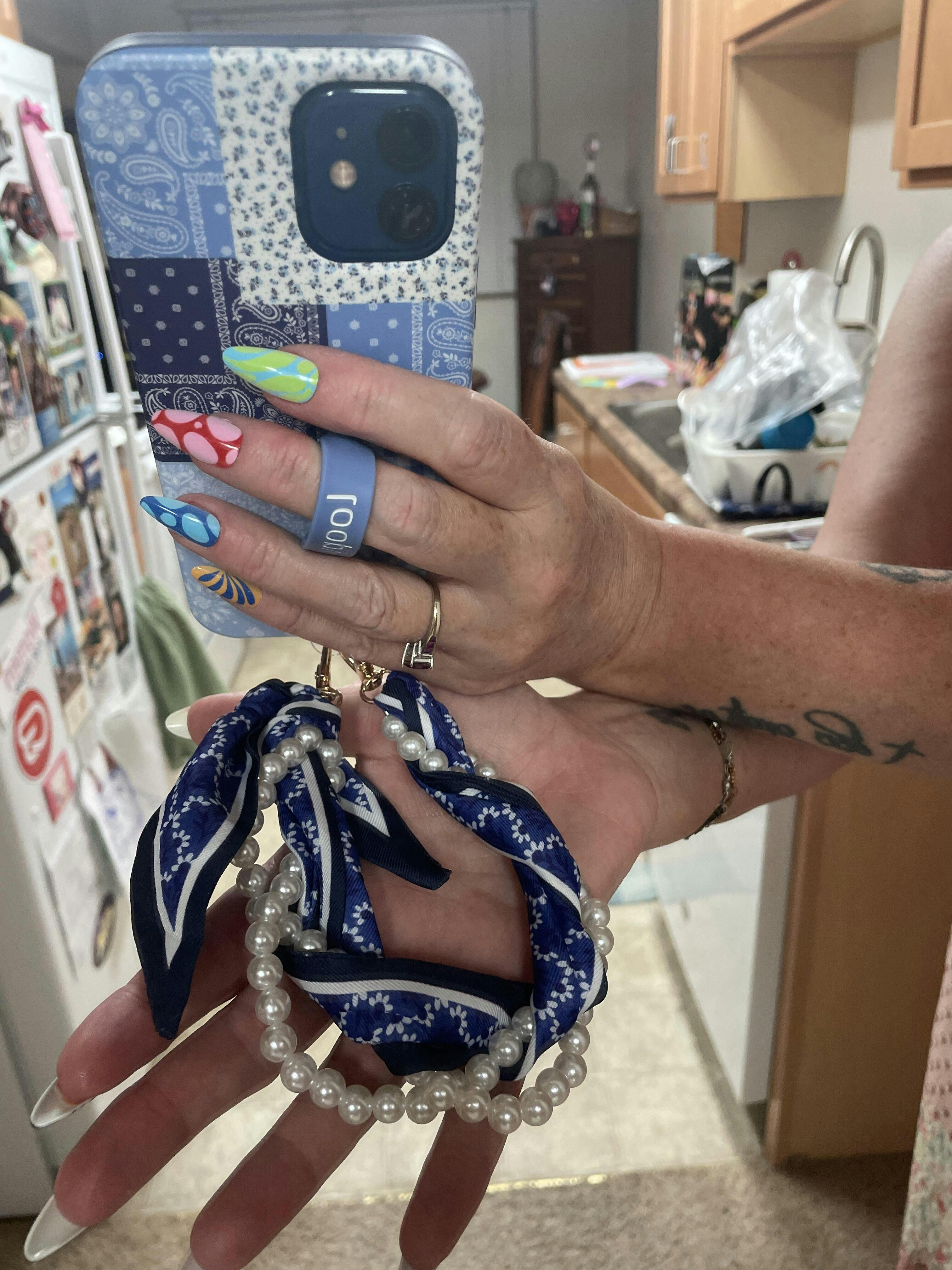 Pretty, pearly, and perfect for keeping your phone close—this wristlet is your new must-have. Wrapped in a floral scarf and stacked with faux pearls, it’s giving sweet meets spirited. It clips right onto your phone using the included clear tether (just tuck it into your case and go!).